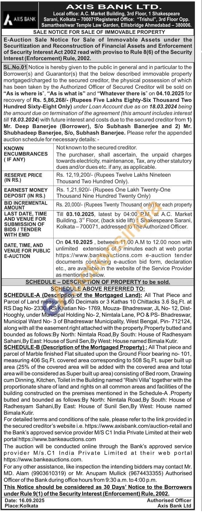 SCHEDULE-A (Description of the Mortgaged Land): All That Piece and Parcel of Land measuring 60 Decimals or 3 Kathas 10 Chittacks 3.6 Sq.Ft. at RS Dag No-2330, RS Khatian No-1769, Mouza-Bhadreswar, JL No-12, Dist-Hooghly, under Municipal Holding No-2, Nimtala Lane, PO & PS- Bhadreswar, Municipal Ward No-3 of Bhadreswar Municipality, West Bengal, Pin-712124, along with all the easement right attached with the property. Property butted and bounded as follows: By North: Nimtala Road, By South: House of Radhesyam Sahani, By East: House of Sunil Sen, By West: House named Bimala Kutir.SCHEDULE-B (Description of the Mortgaged Property): All That piece and parcel of Marble finished Flat situated upon the Ground Floor bearing no-101, measuring 406 Sq. Ft. covered area corresponding to 508 Sq. Ft. super built up area (25% of the covered area will be added with the covered area and total area will be considered as Super built up area) consisting of Bed room, Drawing cum Dinning, Kitchen, Toilet in the Building named "Rishi Villa" together with the proportionate share of land and rights on all common areas and facilities of the building constructed on the premises mentioned in the Schedule-A Property butted and bounded as follows: By North: Nimtala Road, By South: House of Radhesyam Sahani, By East: House of Sunil Sen, By West: House named Bimala Kutir.