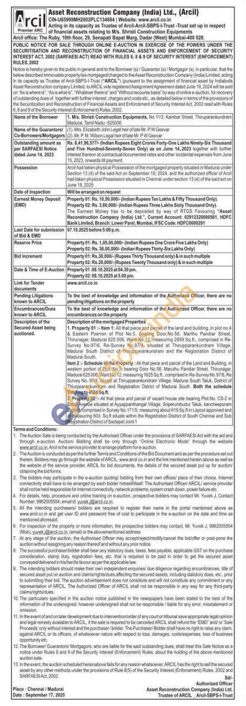 1. Property 01-Itam 1: All that place and pure of the land and building, inn elem Perion of Plist No 1. beseing Door No.58 Marthe Pander Sheet, Thirunagar, Madura 625 000. Ward No. 12. measuring 2960 St. compraed in Re Survey No.976 Ne-Survey No 1974, susatt at Thauppakuлата Vitage Madurai Siuth Disticthakran and the Resta Madurai South2Bchedule of the Property Aparet of the Land and Bulding in westem porton of Plot hio Searing Door Manuth Pantun Thunaga Survey No: 9714, stutte at Thinuppen Totsing to 4584 54.1 congbedic Re-Survey R