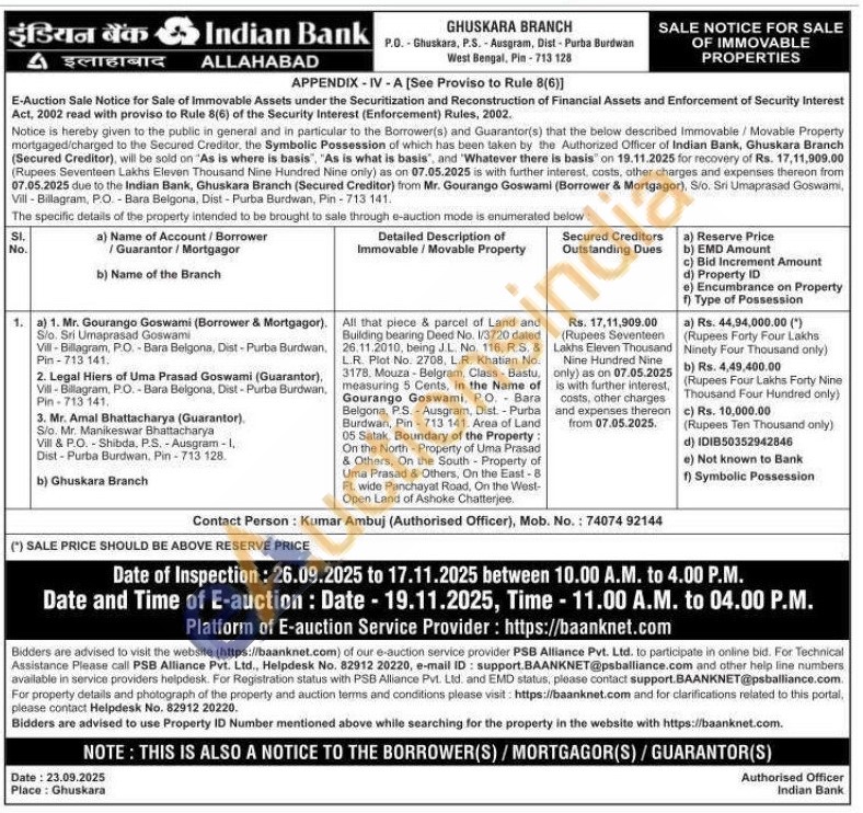All that piece & parcel of Land and Building bearing Deed No. 1/3720 dated 26.11.2010, being J.L. No. 116, R.S. & L.R. Plot No. 2708, L.R. Khatian No. 3178. Mouza - Belgram, Class-Bastu, measuring 5 Cents, in the Name of Gourango Goswami, P.O. Bara Belgona, P.S. -Ausgram, Dist.-Purba Burdwan, Pin-713-141. Area of Land 05 Satak. Boundary of the Property: On the North - Property of Uma Prasad & Others, On the South Property of Uma Prasad & Others, On the East-8 Ft. wide Panchayat Road, On the West-Open Land of Ashoke Chatterjee