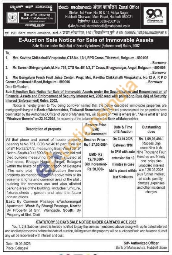 All that piece and parcel of house property bearing M.No 751, CTS No 4015 part, from out of SY No 32/2/4/2, measuring East-West 39' 9" North-South 40' 1590 Sq. ft along with old red tiled building measuring 750 sq. ft situated at 2nd cross, Bhagya Nagar, Angol, Belagavi within the limits of city corporation of Belagavi The said plot and construction thereon property as mentioned herein above with all its easement rights and common area of the plot, building for common use and also allotted parking area of the building, includes furniture, fixtures, sheds, garden and also the future constructions.