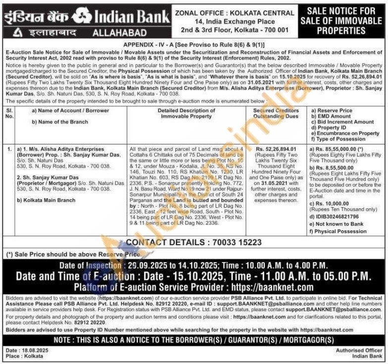 All that piece and parcel of Land msg about 4 Cottahs 6 Chittaks out of 75 Decimals of land be the same or little more or less being Plot No. 10 & 12. under Mouza Kodalia, JL No. 35, RS No. 146. Touzi No. 110, RS Khatian No. 1230, LR Khatian No. 603, RS Dag No. 2199 LR Dag No. 2336, P.S. Sonarpur presently Holding No. 772. J. N. Basu Road, Ward No 19 now 21 under Rajpur Sonarpur Municipality in the District of South 24 Parganas and the Land is butted and bounded by: North-Plot No. 8 being part of LR Dag No. 2336, East-12 feet wide Road, South Plot No. 14 being part of LR Dag No. 2336, West-Plot No. 9 & 11 being part of LR Dag No. 2336.