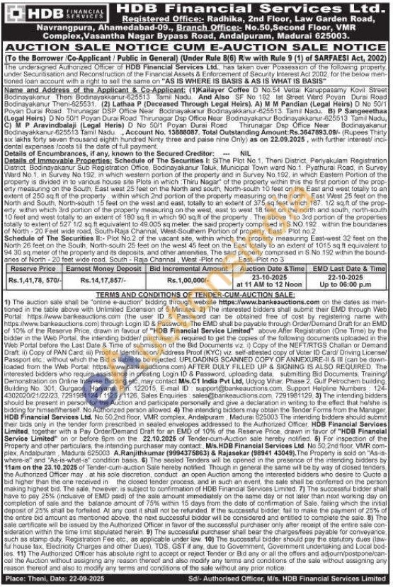Details of Immovable Properties: Schedule of The Securities I: SiThe Plot No. 1, Theni District, Periyakulam Registration District, Bodinayakanur Sub Registration Office, Bodinayakanur Taluk, Municipal Town ward No. 1. Pyathurai Road, in Survey Ward No. 1, in Survey No. 192, in which western portion of the property and in Survey No. 192, in which Eastern Portion of the property is divided in to various house site Plots in which: Thiru Nagar" of the property within this the first portion of the prop erty measuring on the South, East west 25 feet on the North and south, North-south 10 feet on the East and west totally to an extent of 250 sq ft of the property within which 2nd portion of the property measuring on the north, East West 25 feet on the North and South, North-south 15 feet on the west and east, totally to an extent of 375 sq.feet which 187. 1/2 sq.ft of the prop-erty within which 3rd portion of the property measuring on the west, east to west 18 feet on the north and south, north-south 10 feet and west totally to an extent of 180 sq ft in which 90 sq ft of the property. The above 1 to 3rd portion of the properties totally to extent of 527 1/2 sq.ft equivalent to 49.005 sq meter. the said property comprised in S.NO.192, within the boundaries of North-20 Feet wide road, South-Raja Channal, West-Southern Portion of property, East-Plot no 2.