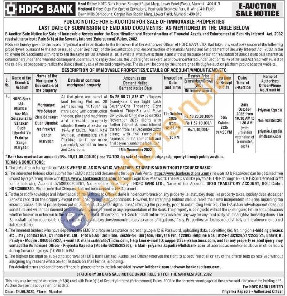 All that piece and parcel of land bearing Plot no. 36 admeasuring 1016.47 sq mtrs along with construction thereon, plant and machinery and movable property situated therein at sector no 19-A, at CIDCO, Vashi, Navi Mumbai, Maharashtra (Milk Packing Unit) as more particularly set out in Terms and Conditions
