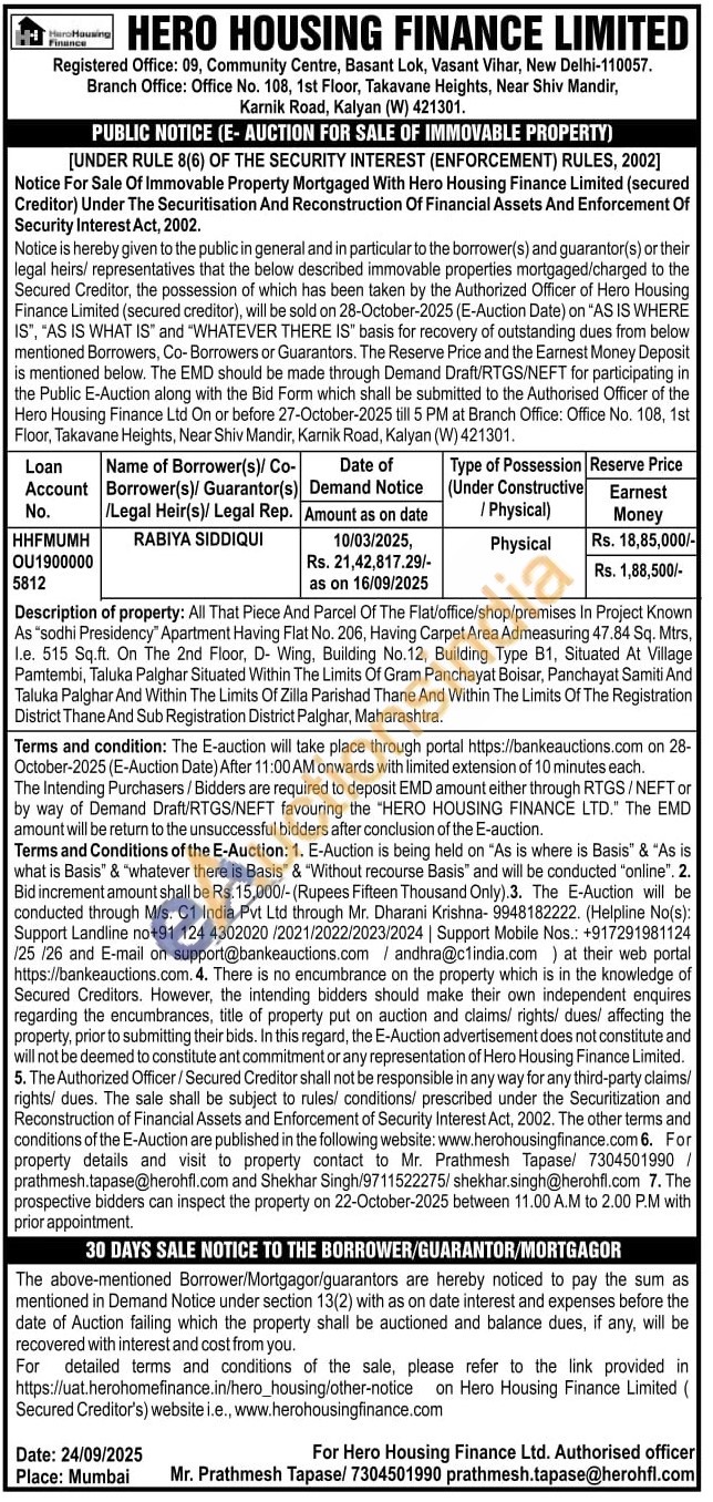 Description of property: All That Piece And Parcel Of The Flat/office/shop/premises In Project Known As "sodhi Presidency" Apartment Having Flat No. 206, Having Carpet Area Admeasuring 47.84 Sq. Mtrs, I.e. 515 Sq.ft. On The 2nd Floor, D- Wing, Building No.12, Building Type B1, Situated At Village Pamtembi, Taluka Palghar Situated Within The Limits Of Gram Panchayat Boisar, Panchayat Samiti And Taluka Palghar And Within The Limits Of Zilla Parishad Thane And Within The Limits Of The Registration District Thane And Sub Registration District Palghar, Maharashtra