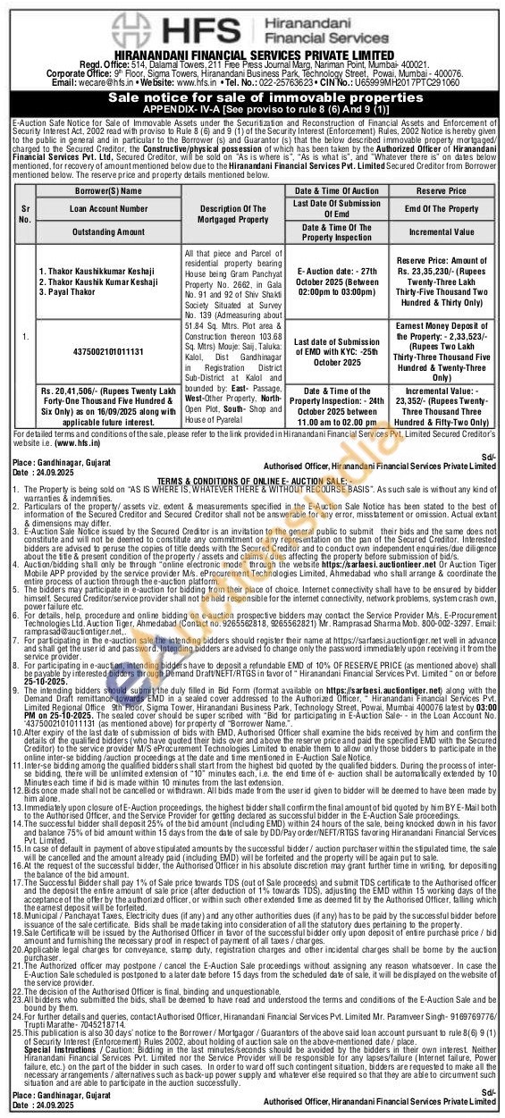 All that piece and Parcel of residential property bearing House being Gram Panchyat Property No. 2662, in Gala No. 91 and 92 of Shiv Shakti Society Situated at Survey No. 139 (Admeasuring about 51.84 Sq. Mtrs. Plot area & Construction thereon 103.68 Sq. Mtrs) Mouje: Saij, Taluka: Kalol, Dist Gandhinagar in Registration District Sub-District at Kalol and bounded by: East Passage, West-Other Property, North-Open Plot, South- Shop and House of Pyarelal