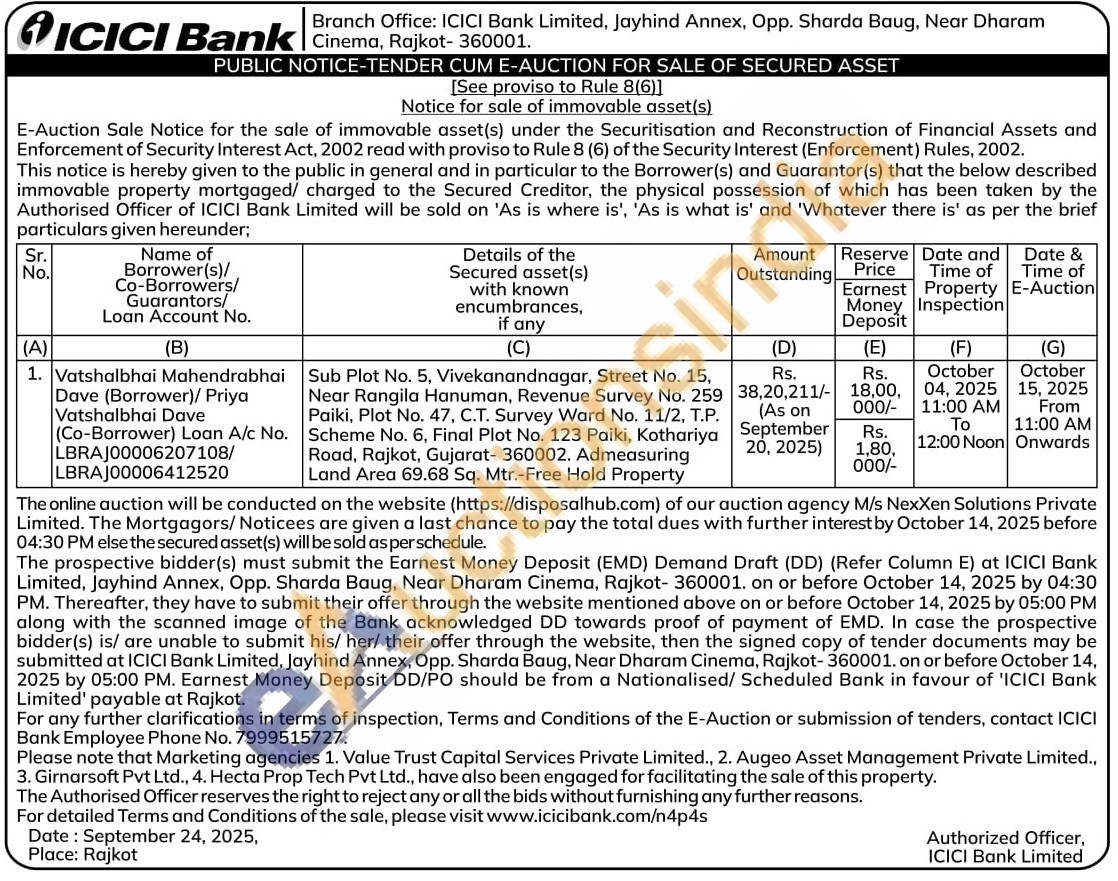 Sub Plot No. 5, Vivekanandnagar, Street No. 15, Near Rangila Hanuman, Revenue Survey No. 259 Paiki, Plot No. 47, C.T. Survey Ward No. 11/2, Τ.Ρ. Scheme No. 6, Final Plot No. 123 Paiki, Kothariya Road, Rajkot, Gujarat- 360002. Admeasuring Land Area 69.68 Sq. Mtr.-Free Hold Property