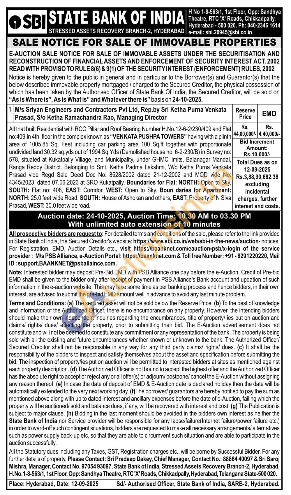 All that built Residential with RCC Pillar and Roof Bearing Number H.No.12-6-2/230/409 and Flat Rs. no:409, in 4th floor in the complex known as "VENKATA PUSHPA TOWERS" having with a plinth area of 1005.85 Sq. Feet including car parking area 100 Sq.ft together with proportionate undivided land 30.32 sq.yds out of 1994 Sq. Yds (Demolished house no: 6-2-230/B) in Survey no: 578, situated at Kukatpally Village, and Municipality, under GHMC limits, Balanagar Mandal, Ranga Reddy District. Belonging to Smt. Ketha Padma Lakshmi, W/o Ketha Purna Venkata Prasad vide Regd Sale Deed Doc No: 8528/2002 dated 21-12-2002 and MOD vide No: 4345/2023, dated 07.06.2023 at SRO Kukatpally. Boundaries for Flat: NORTH: Open to Sky. SOUTH: Flat no: 408, EAST: Corridor, WEST: Open to Sky. Boun daries for Apartment: NORTH: 25.0 feet wide Road, SOUTH: House of Ashokan and others, EAST: Property of N Siva Prasad, WEST: 30.0 feet wide road.