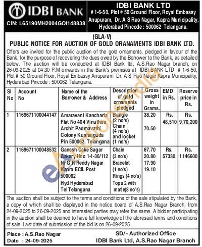 IDBI Bank Gold Auctions Auction in Medchal-Malkajgiri