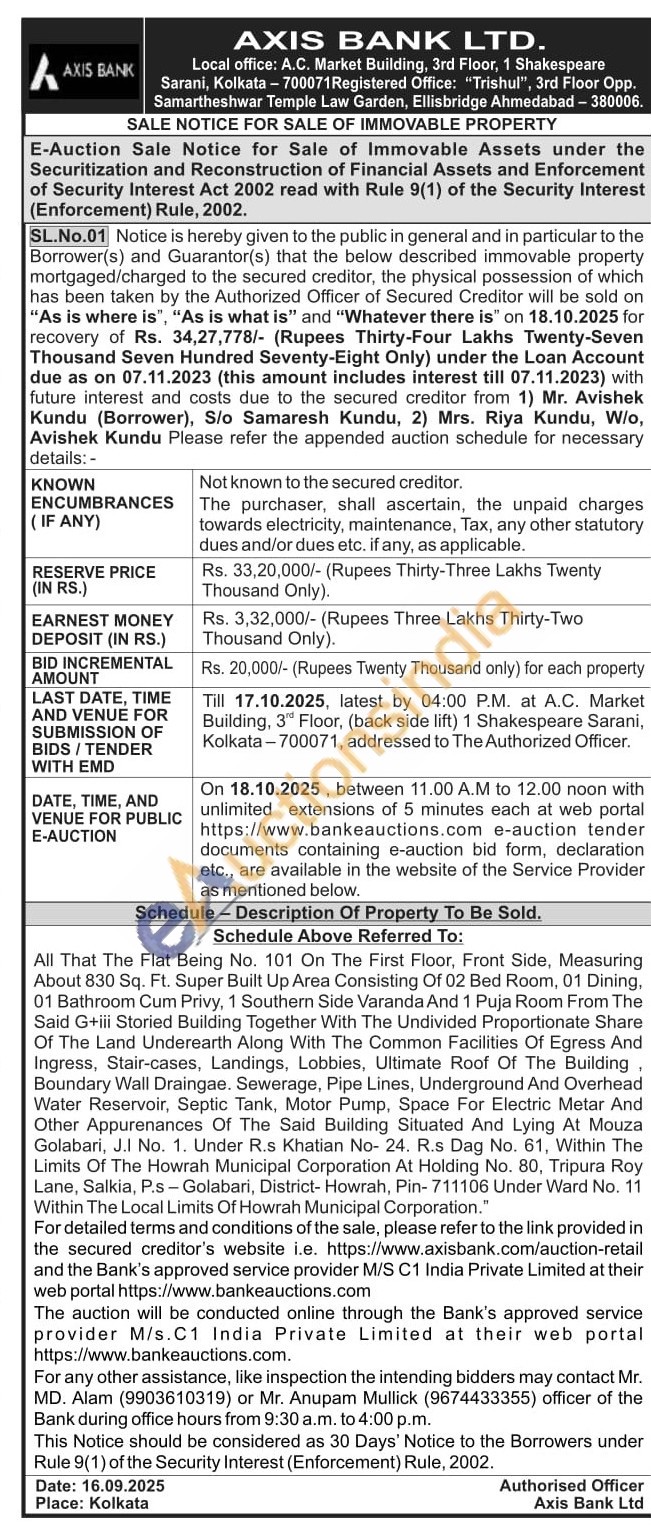 All That The Flat Being No. 101 On The First Floor, Front Side, Measuring About 830 Sq. Ft. Super Built Up Area Consisting Of 02 Bed Room, 01 Dining. 01 Bathroom Cum Privy, 1 Southern Side Varanda And 1 Puja Room From The Said G+iii Storied Building Together With The Undivided Proportionate Share Of The Land Underearth Along With The Common Facilities Of Egress And Ingress, Stair-cases, Landings, Lobbies, Ultimate Roof Of The Building, Boundary Wall Draingae. Sewerage, Pipe Lines, Underground And Overhead Water Reservoir, Septic Tank, Motor Pump, Space For Electric Metar And Other Appurenances Of The Said Building Situated And Lying At Mouza Golabari, J.I No. 1. Under R.s Khatian No- 24. R.s Dag No. 61, Within The Limits Of The Howrah Municipal Corporation At Holding No. 80, Tripura Roy Lane, Salkia, P.s-Golabari, District- Howrah, Pin-711106 Under Ward No. 11 Within The Local Limits Of Howrah Municipal Corporation."
