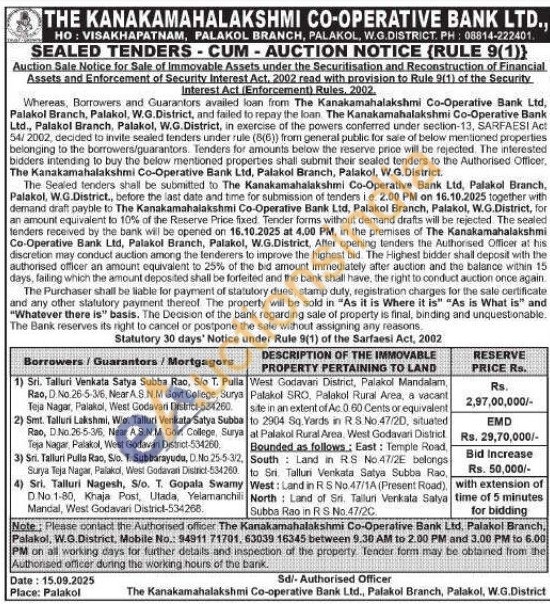 West Godavari District, Palakol Mandalam, Palakol SRO, Palakol Rural Area, a vacant site in an extent of Ac 0.60 Cents or equivalent to 2904 Sq. Yards in RS. No.47/20, situated at Palakol Rural Area, West Godavari District Bounded as follows: East: Temple Road , South Land in RS No.47/2E belongs to Sri. Tallun Venkata Satya Subba Rao, West: Land in RS No. 47/1A (Present Road), North Land of Sri. Talluri Venkata Satya Subba Rao in RS No.47/2C