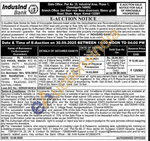 House property measuring 242 Sq, yds (e.8 Maria being 8/4893 share of 244K- 13M comprised in Khewal No. 1309 Khatoni no 2191 Kittas 37 vide jamabandi for the year of 2013-2014, situated at Village Rajound Tehsil Rajound& Dist Kaithal within Muncipal Limits Cheeks all nights appurtenant there vide Sale Deed bearing , vasika no 731, dated 21.09.2018 registered in the office of S R Rajound and Mutation No. 11620 dated 25.09.2018 which is bounded by: North: Gali 20 feet, South: Land of Saller, East Plot of Sh. Mann Singh, West, Gali 18 feet