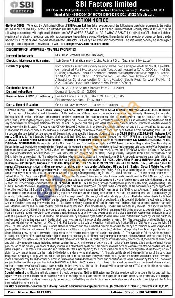 Immovable Residential Property bearing all that piece and parcel of Flat No. 801 and 802 comprised of Pent House along alc with Terrace admeasuring CA of 2200 sq. ft of the Building known as "Trimurti Apartment constructed on properties bearing Sub-Plat No. 17,18,19,20 of F.P. 78 at T. P. Scheme No.5, situated near Ambikaniketan Bus Stop, Athwa Lines, Surat bounded by: On North: Road; On South: Road; On West: Plot No. 16 & 20: On East: Road (In the Name of Mrs. Pratima P Shah)