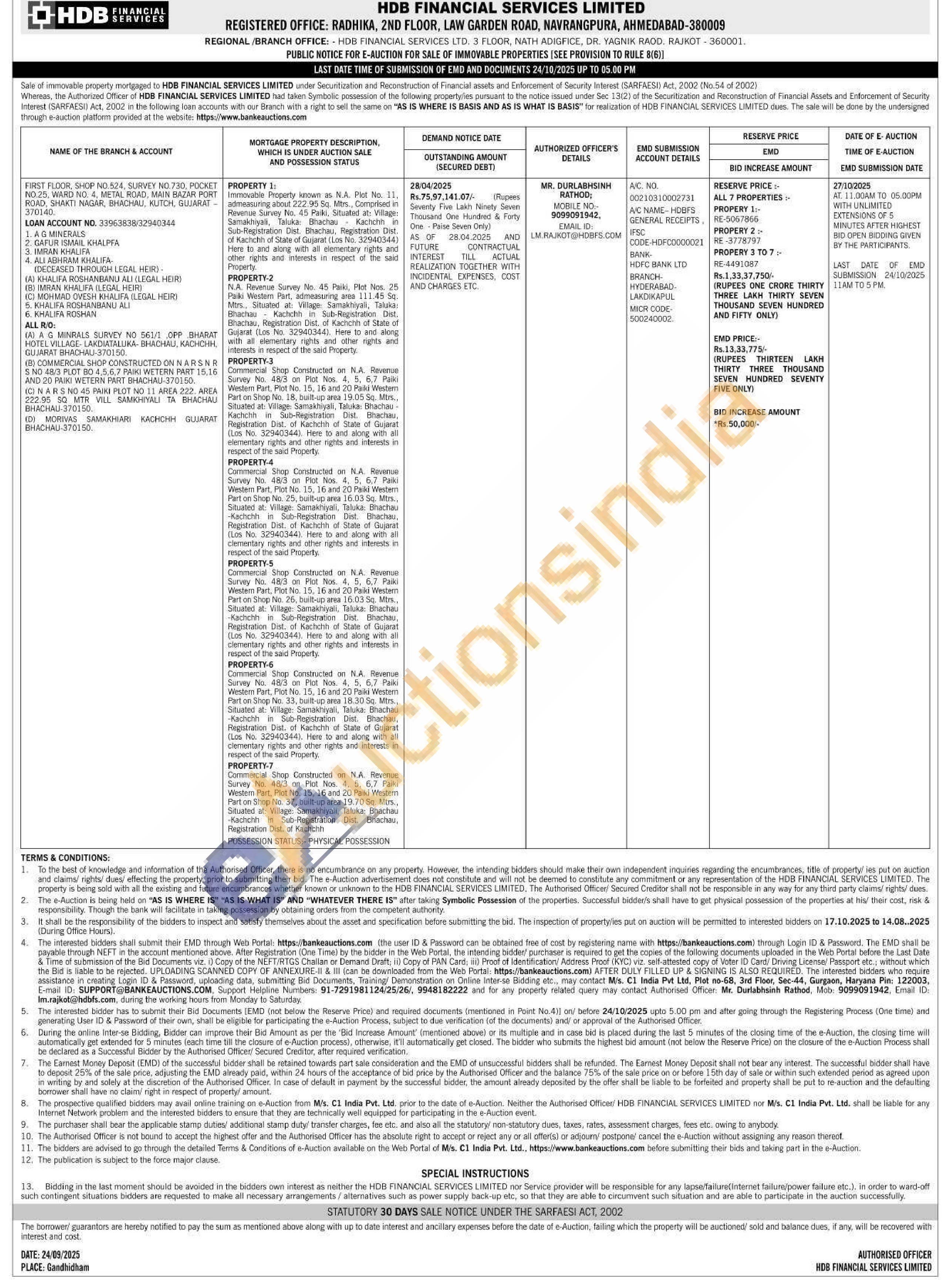 Immovable Property known as N.A. Plot No. 11, admeasuring about 222.95 50. Mtrs., Comprised in Revenue Survey No. 45 Paiki, Situated at: Village: Samakhiyali, Taluka: Bhachau Kachchh in Sub-Registration Dist. Bhachau, Registration Dist. of Kachchh of State of Gujarat (Los No. 32940344) Here to and along with all elementary rights and other rights and interests in respect of the said Property PROPERTY-2 N.A. Revenue Survey No. 45 Paiki, Plot Nos. 25 Paiki Western Part, admeasuring area 111.45 Sq. Mtrs, Situated at: Village Samakhiyali, Talukas Bhachau Kachchh in Sub-Registration Dist. Bhachau, Registration Dist, of Kachchh of State of T Gujarat (Los No. 32940344). Here to and along with all elementary rights and other rights and Interests in respect of the said Property R PROPERTY-3 6 Commercial Shop Constructed on N.A. Revenue Survey No. 48/3 on Plot Nos. 4, 5, 6,7 Paiki A Westem Part. Plot No. 15, 16 and 20 Palki Westem Part on Shop No. 18, built-up area 19.05 Sq. Mtrs., Situated at: Village: Samakhiyali, Taluka Bhachau-Kachchh in Sub-Registration Dist. Bhachau, Registration Dist. of Kachchh of State of Gujarat (Los No. 32940344). Here to and along with all elementary rights and other rights and interests in respect of the said Property PROPERTY-4 Commercial Shop Constructed on N.A. Revenue Survey No. 48/3 on Plot Nos. 4, 5, 6,7 Paiki Western Part, Plot No. 15, 16 and 20 Paiki Westerm Part on Shop No. 25, built-up area 16.03 Sq. Mtrs., Situated at: Village: Samakhiyali, Taluka Bhachau -Kachchh in Sub-Registration Dist. Bhachau, Registration Dist, of Kachchh of State of Gujarat (Los No. 32940344). Here to and along with all clementary nights and other rights and interests in respect of the said Property PROPERTY-5 Commercial Shop Constructed on N.A. Revenue Survey No. 48/3 on Plot Nos. 4, 5, 6.7 Paiki Westem Part. Plot No. 15, 16 and 20 Paiki Westerm Part on Shop No. 26, built-up area 16.03 Sq. Mtrs., Situated at: Village: Samakhiyali, Taluka: Bhachau Kachchh in Sub-Registration Dist. Bhachau, Registration Dist. of Kachchh of State of Gujarat (Los No. 32940344). Here to and along with all clementary rights and other rights and interests in respect of the said Property PROPERTY-6 Commercial Shop Constructed on N.A. Revenue Survey No. 48/3 on Plot Nos. 4, 5, 6,7 Paiki Westem Part, Plot No. 15, 16 and 20 Palki Westem Part on Shop No. 33, built-up area 18.30 Sq. Mtrs., Situated at: Village: Samakhyali, Taluka: Bhachau Kachchh in Sub-Registration Dist. Bhachau, Registration Dist. of Kachchh of State of Gujarat (Los No. 32940344). Here to and along with all clementary rights and other rights and interests in respect of the said Property PROPERTY-7 Commercial Shop. Constructed on N.A. Revenue Survey No. 46/3 on Plot Non. 4, 5, 6,7 Paiki Western Part, Plot No. 15, 16 and 20 Paiki Westem Part on Shop No. 37, built-up area 19.70 Sq. Mtrs., Situated at: Viitage: Samakhiyali, Taluka Bhachau Kachchh in Sub-Registration Dist. Bhachau, Registration Dist. of Kachchh