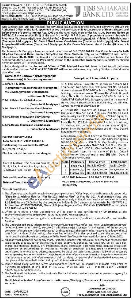 Residential Property of, Known as "Ambawadi Plot" Non Agri Land, Plots paiki Plot No. 158, Land Admeasuring area 185-80-67 5q. Mtrs, 500-00 5q. Gaj. Building thereon. known as "Raghunandan Flats Paiki 3rd Floor, Flat No. 302, built up Area 61-995 Sq. Mtrs, in Keshod, Tal: Keshod, Dist. Junagadh stand in the name of (1) Mr. Devani. Bhavikkumar Vinodchandra and (ii) Mrs. Devani Pragnyaben Bhavikkumar.