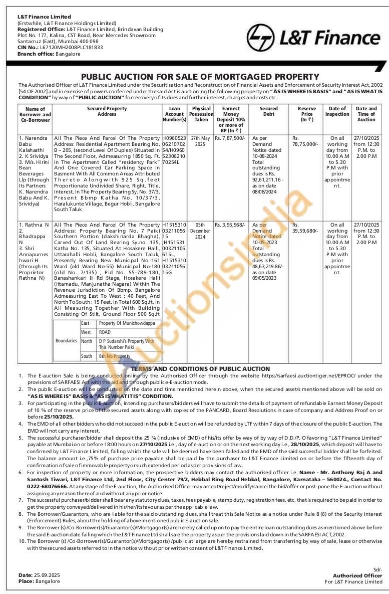 All The Piece And Parcel Of The Property Address: Residential Apartment Bearing No. B-205, (second Level Of Duplex) Situated In The Second Floor, Admeasuring 1850 Sq. Ft. In The Apartment Called "residency Park" And One Covered Car Parking Space In Basment With All Common Areas Attributed Thereto Along with 925 Sq.feet Proportionate Undivided Share, Right, Title, Interest, In The Property Bearing Sy. No. 37/3, Present Bbmp Katha No. 10/37/3, Haralukunte Village, Begur Hobli, Bangalore South Taluk