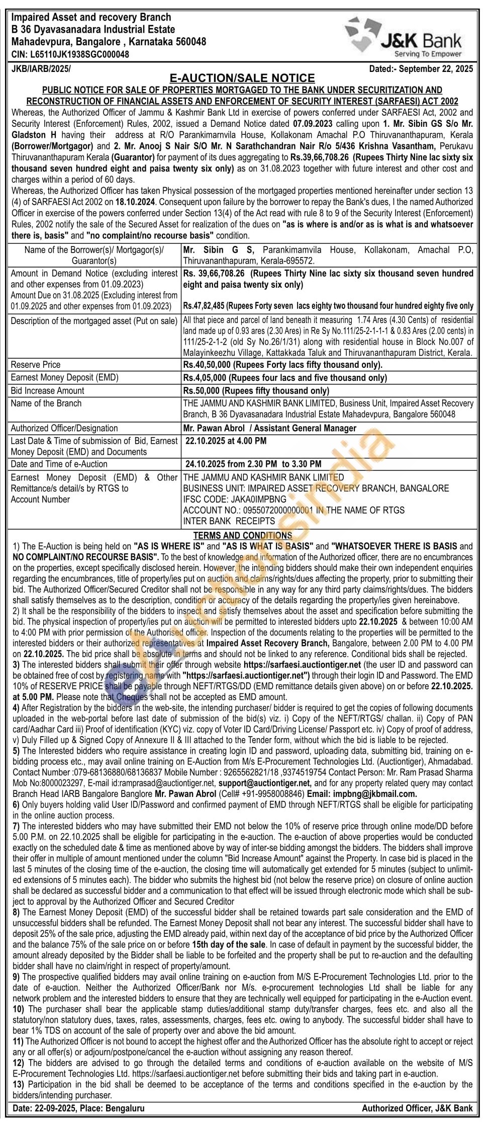 All that piece and parcel of land beneath it measuring 1.74 Ares (4.30 Cents) of residential land made up of 0.93 ares (2.30 Ares) in Re Sy No.111/25-2-1-1-1 & 0.83 Ares (2.00 cents) in 111/25-2-1-2 (old Sy No.26/1/31) along with residential house in Block No.007 of Malayinkeezhu Village, Kattakkada Taluk and Thiruvananthapuram District, Kerala.