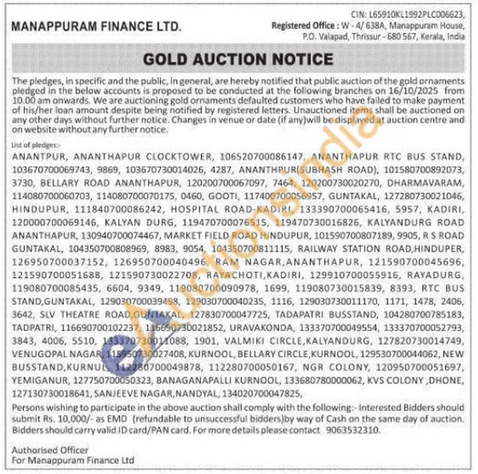 Manappuram Finance Ltd Gold Auctions Auction in Anantapur