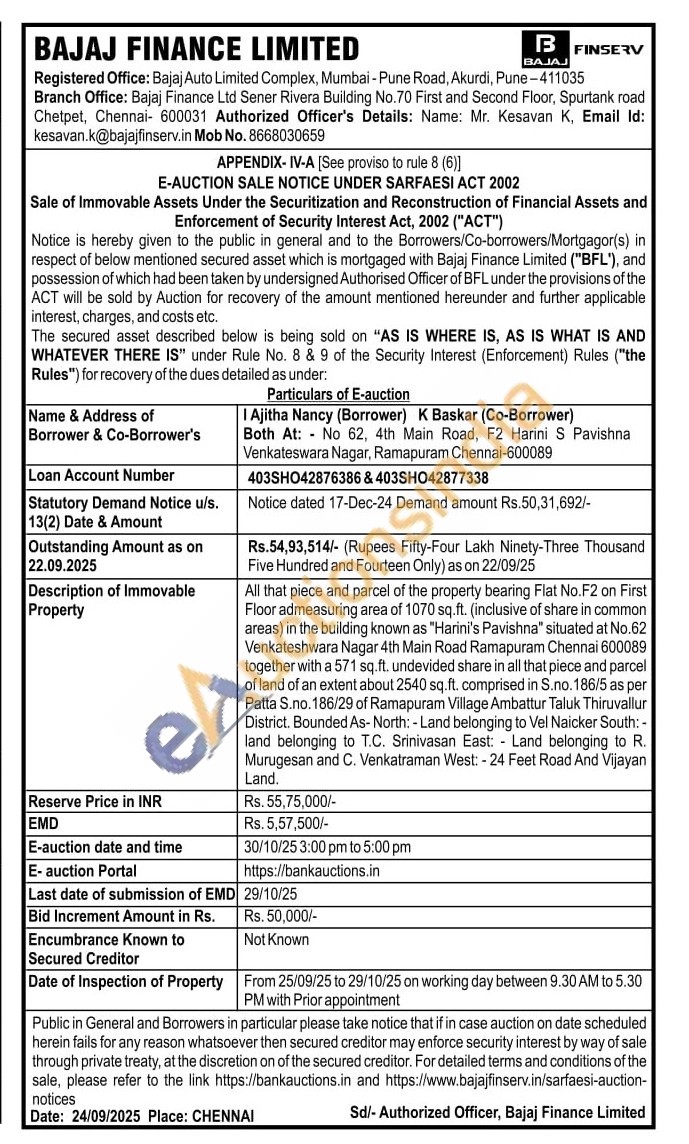 All that piece and parcel of the property bearing Flat No.F2 on First Floor admeasuring area of 1070 sq.ft. (inclusive of share in common areas) in the building known as "Harini's Pavishna" situated at No.62 Venkateshwara Nagar 4th Main Road Ramapuram Chennai 600089 together with a 571 sq.ft. undevided share in all that piece and parcel of land of an extent about 2540 sq.ft. comprised in S.no. 186/5 as per Patta S.no. 186/29 of Ramapuram Village Ambattur Taluk Thiruvallur District. Bounded As-North: - Land belonging to Vel Naicker South: -land belonging to T.C. Srinivasan East: Land belonging to R. Murugesan and C. Venkatraman West: - 24 Feet Road And Vijayan Land.