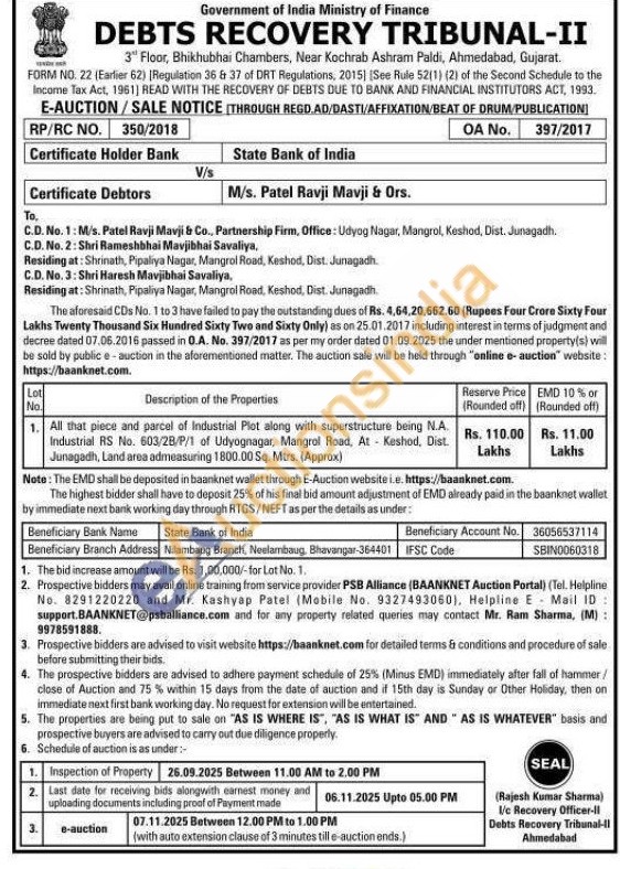 . All that piece and parcel of Industrial Plot along with superstructure being N.A. Industrial RS No. 603/28/P/1 of Udyognagar, Mangrol Road, At Keshod, Dist. Junagadh, Land area admeasuring 1800.00 Sq. Mtrs. (Approx)