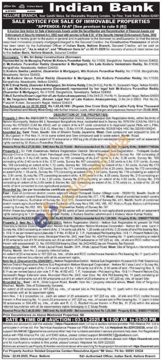 Property-1 (Doc No.362/8/2017): Nelore Registradon Diatrict, Stonehousepet Sub Registration Ints, within the limits of Nailore Municipality, Nalore Bit 2. Nawabpor Banglahota Area, residential land in Survey No. 1578/154 (CAS No. 150/1) & Survey No. 1576/203 (CAS No. 150/2) with an extent of Ac 467 cents converted in to Approved Layout Plots with LPNo 16/51, within which Plot Nos. 12 & 13, Ward No. 1, D No. 1/1176, Assessment No. 1031001424, HSC No. 3321101006241 bounded by: East Road, South: Site of Bheemi Reddy Jayamma, West: Own compound wall adjacent to Site of E. Murugesan in Plot Nos. 11,14 to some extent and Own compound wall to some extent, North: Road Within these boundaries an eidert of 70 ankanams or 560 sq yrds of site and residential house therein with all essement rights owned by Mr Kaduru Purandhar Reddy