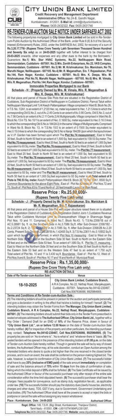 1) All that piece and parcel of House Site Plots that are situated in the Registration District of Cuddalore, Sub-Registration District of Nellikuppam in Cuddalore District, Parrus Taluk within Nellikuppam Municipal Limit 1) At Keezh Patampakkam Village comprised in Ward B. Block No 26, inTS. No. 1/2A1, to an extent of 1,2120 Hec. sq. meter equivalent to Hec. 1.21.5 Ares to which the corresponding Old S.No 2 out of Ac. 2.45 Cents to an extent of Ac 0.90 Cents, Old S.No. 3, out of Ac. 7.56 Cents to an extent of Ac 2.11 Cents 2) At Mulligrampattu Village comprised in Ward No.B. Block No. 13 in T5 No 10/1 to an extent of Hec. 0.1600 5 metar equivalent to Hec 0.16.0 Ares to which the corresponding Old S. No is 184/243) In the same Village of Milligrampatsu Comprised in Ward No B. Block No. 13, in T.S.No. 10/2 to an extent of 0.1500 Sq.meter equivalent to Hec 0.15.0 Ares to which the comesponding Old S.No is Nanja 184/28 Upon which the layout known as VIP Garden has been formed upon which The Plot No. 74 measurement: East to West 30 feet, South to North 50 feet to an extent of 1,500 Sq feet equivalent to 139.53 Sqmeter. The Plot No.75 measurement: East to West 20 feet, South to North 50 feet to an extent of 1,000 Sqleet equivalent to 83 Sq meter. The Plot No.76 measurement: East to West 20 feet, South to North 50 feet to an extent of 1,000 Sq feet equivalent to 9354. meter. The Plot No.77 measurement: East to West 20 feet, South to North 50 feet to an extent of 1,000 Sq. feet equivalent to 93 So meter The Plot No.78 measurement: East to West 20 feet, South to North 50 feet to an extent of 1,000 Sq feet equivalent to 93 Sq meter. The Plot No. 79 measurement: East to West 20 feet, South to North 50 feet to an extent of 1,000 Sq. fest equivalent to 83 Sq meter. The Plot No.80 measurement: East to West 20 feet. South to North 50 feet to an extent of 1,000 Sq. feet equivalent to 03 Sq. meter and The Plot No 81 measurement: East to West 20 feet, South to North 50 feet to an extent of 1,000 Sq feet equivalent to 93 Sq meter in all Total extent of & Plots is 790.53 Sq. meter. Keezh Pattampakkam Want 8, Block 26. TS.No. 1/2A1. 8500 Sq.ft. Common Boundaries for the above Eight Plots East of: Plot No. 82 West of: Plot Nos 72 and 73, South of Plot Nos 63 to 70 and North of 20 feet breadth Layout 1st Main Road
