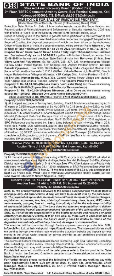 All that part and pacel of factory land, Building, Plant & Machinery admeasuring Ac 1-47 cants or 0.595 hectors situated at Sy No-325/1 Ac 0.15 cents Sy. No-320/2 Ac 0.65 cents, Sy No-327/1 Ac 0.15 cents, Sy No-328/5 Ac 0.26 cents, Sy No-328/2 Ac 0.26 cents in total Ac 1.47 cents situated at Anantharajupeta Grama Panchayat and Village, Kodur Mandal, Pullampet Sub-Dist Kadapa District registred in the name of Mis Sree Vijayalakshmi Pulverisers vide sale deed No-3135/2011, dated 26.11.2011 registered at SRO Pullampeta and bounded by: East: Land belongs to icon minerals, West: 20 ft, width road. North: 20ft width road, South: land belongs to P.Krishna Murthy (vendor) 2). Plant & Machinery: (a) Four Roller Pulverising mill complete set up having capacity of 5 to 6 ton. (b) 16"X9 Jaw crusher without motor. (c) Belt Conveyor (d) Electrical items complete including motors, control panels, KVAR etc. (e) Transformer setup complete including DP structure (f) EOT Crane.