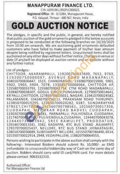 Manappuram Finance Ltd Gold Auctions Auction in Chittoor