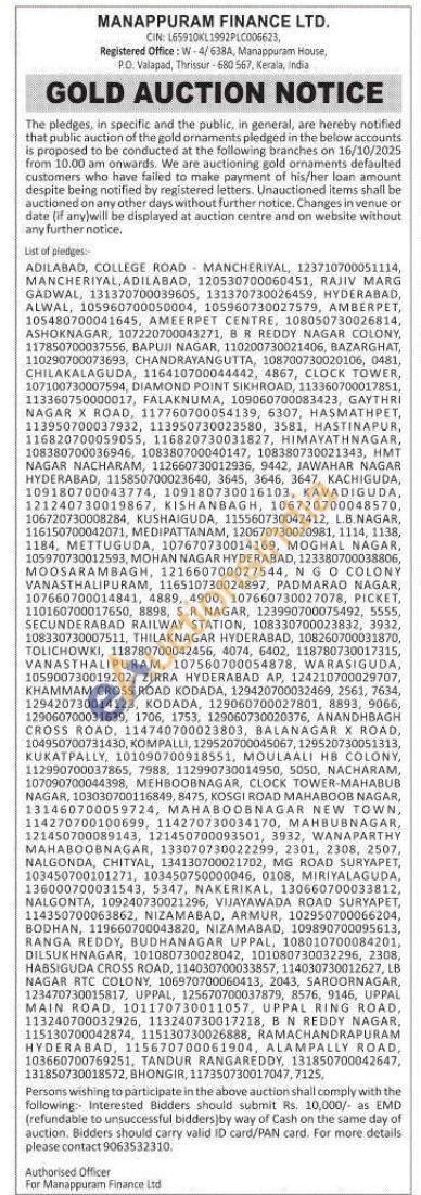 Manappuram Finance Ltd Gold Auctions Auction in Adilabad