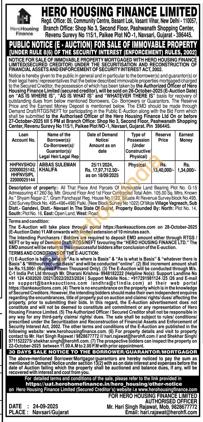 Description of property: All That Piece And Parcels Of Immovable Land Bearing Plot No. G-15 Admeasuring 47.260 Sq. Mtr. Ground Floor And 1st Floor Contracted Total Adm. 105.00 Sq. Mtrs, Known As Shyam Nagar-2,", Gram Panchayat Reg. House No 1123, Situate At Revenue Survey/block No.495, (Old Survey/Block No. 495+496+498) Paiki, (New Block/Survey No 1022) Of Moje Village Vagreach, Sub Distt.- Gandevi, Distt.- Navsari In The State Of Gujrat. Property Bounded By: North: Plot No. 14, South: Plot No. 16. East: Open Land, West: Road