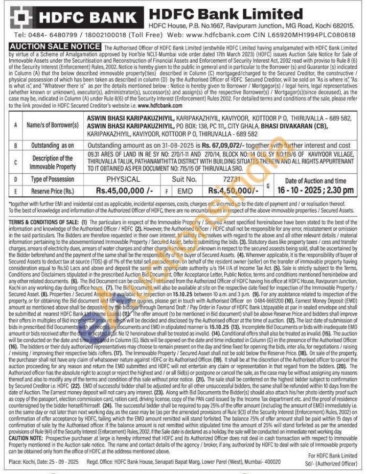 09.31 ARES OF LAND IN RE SY NO: 270/1-11 AND 270/14, BLOCK NO: 14 OLD SY NO:119/6 OF KAVIYOOR VILLAGE, THIRUVALLA TALUK, PATHANAMTHITTA DISTRICT WITH BUILDING SITUATES THEREIN AND ALL RIGHTS APPURTENANT TO IT OBTAINED AS PER DOCUMENT NO: 715/15 OF THIRUVALLA SRO.
