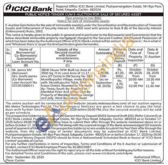 3BHK House With Built Up Area of 2500 Sq. Ft In Land Area of 11.17 ares (27 Cents) in Old Survey No. 28/2 Muvattupuzha Village, Avaly Pancha yath, Muvattupuzha Toluk, Ernakulam District. Bounded on The North By: Thodu South By: Property of Manikkal Peter And James East By: Property of Manikkal Mathew George and Jolly. West By: Colony Road