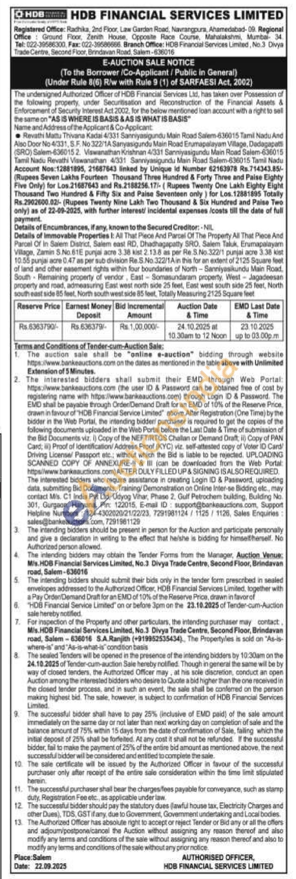 Details of Immovable Properties I: All That Piece And Parcel Of The Property All That Piece And Parcel Of In Salem District, Salem east RD, Dhadhagapatty SRO, Salem Taluk. Erumapalayam Village, Zamin S.No.61E punjai acre 3.38 kist 2.13.8 as per Re S.No.322/1 punjai acre 3.38 kist 10.55 punjai acre 0.47 as per sub division Re.S.No.322/1A in this for an extent of 2125 Square feet of land and other easement rights within four boundaries of North-Sanniyasikundu Main Road, South Remaining property of vendor, East-Somasundaram property, West-Jagadeesan property and road, admeasuring East west north side 25 feet, East west south side 25 feet, North south east side 85 feet, North south west side 85 feet, Totally Measuring 2125 Square feet