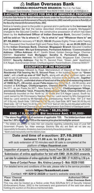 Equitable Mortgage followed by Regd. Memorandum of Deposit of Title Deeds of Residential Flat bearing No.15, Second Floor, in the building known as "Green Jade", with a built up area of 1047 Sq.Ft., along with all other common rights, and right to use of pathways, accesses, amenities, inclusive of car parking etc., together with 468.75 Sq.Ft., undivided share of land out of the total land measuring extent of 15896 Sq.Ft., (36 cents), as per Patta measuring 15042 Sq. ft., (34.58 cents), and situated at S.K.Nagar, Chettiyaragaram, Chennai-600116, Comprised in Survey No.57/1, as por Paata No.3671, New Survey No 57/1C, Chettiyaragaram Village, previously Ambattur Taluk, Presently Maduravoyal Taluk, Chennai District, and thereabouts bounded on the North by: 30 Road and S.K. Nagar Layout. South by: Land owned by Mr.Chinnasamy Naicker, East by: Land owned by Mrs. Gangammal, West by: Land owned by Mr.Nandakumar, admeasuring: North Side: 154 2.5' feet (47.0 Sq.mt), South Side: 1399 feet (42.60 Sq.mt), East Side: 98'5" feet (30.00 Sq.mt) West side: 34'1.5 feet (10.40 Sq. mt) 70′10.5 feet (25.60 Sq.mt) Situated within the Registration District of Chennal South and Registration Sub District of Saidapet Joint