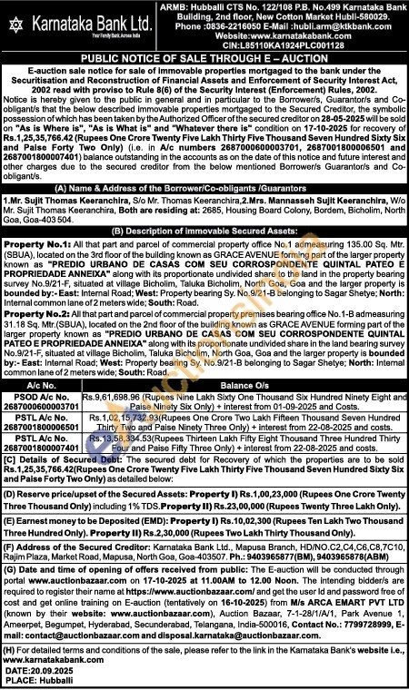 Property No.1: All that part and parcel of commercial property office No.1 admeasuring 135.00 Sq. Mtr. (SBUA), located on the 3rd floor of the building known as GRACE AVENUE forming part of the larger property known as "PREDIO URBANO DE CASAS COM SEU CORROSPONDENTE QUINTAL PATEO E PROPRIEDADE ANNEIXA" along with its proportionate undivided share to the land in the property bearing survey No.9/21-F, situated at village Bicholim, Taluka Bicholim, North Goa, Goa and the larger property is bounded by:- East: Internal Road; West: Property bearing Sy. No.9/21-B belonging to Sagar Shetye; North: Internal common lane of 2 meters wide; South: Road