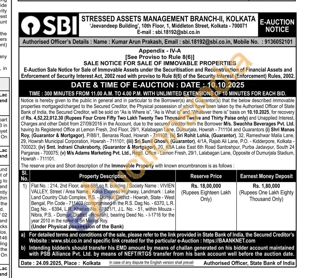 Flat No.: 214, 2nd Floor, area 666 sq.ft. Building / Society Name: VIVIEN VALLEY, Street/Area Name: Kona Express Highway, Landmark: Lake Land Country Club Complex, P.S. - Domjur, District - Howrah, State - West Bengal, Pin Code-711403 (compromised in the R.S. Dag No. - 6370, L.R. Dag No.6394, L.R. Khatian No. 1821/1, J.L. No. 51, within Mouza Nibra, P.S. Domjur, District - Howrah),