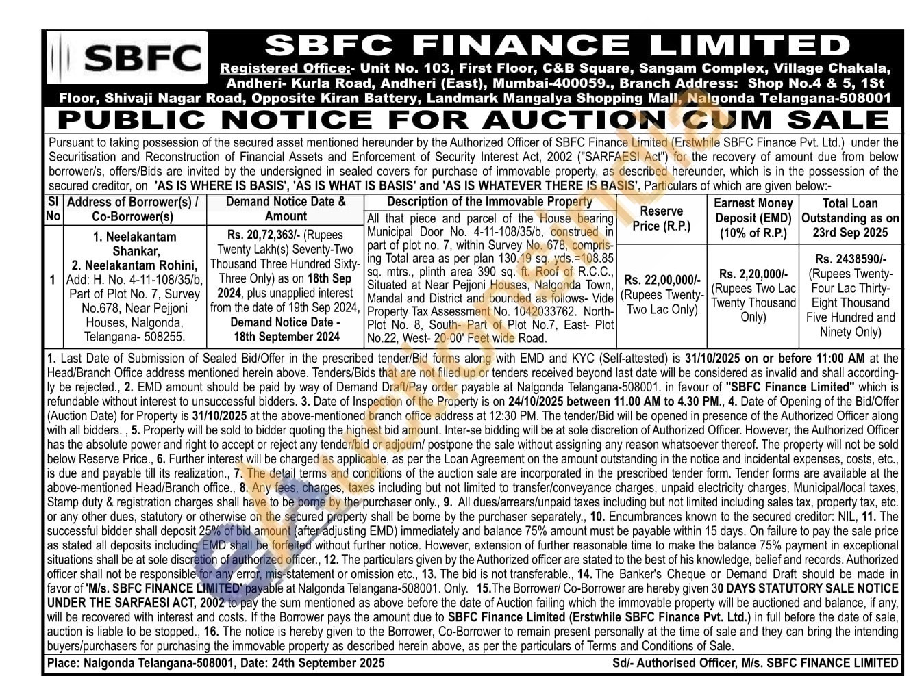 All that piece and parcel of the House bearing Municipal Door No. 4-11-108/35/b, construed in part of plot no. 7, within Survey No. 678, compris-ing Total area as per plan 130.19 sq. yds.=108.85 sq. mtrs., plinth area 390 sq. ft. Roof of R.C.C., Mandal and District and bounded as follows- Vide Situated at Near Pejjoni Houses, Nalgonda Town, Property Tax Assessment No. 1042033762. North-Plot No. 8, South Part of Plot No.7, East- Plot No.22, West-20-00' Feet wide Road