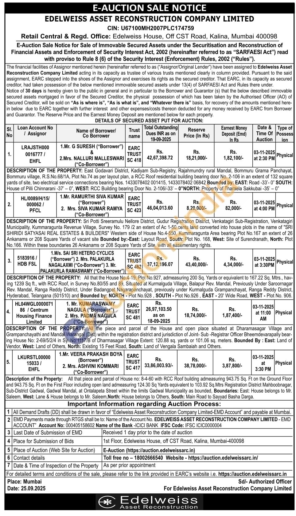Description of the Property: All that piece and parcel of House no: 8-4-60 with RCC Roof building admeasuring 943.75 Sq. Ft on the Ground Floor and 943.75 Sq. Ft on the First Floor including open land admeasuring 124.30 Sq Yards equivalent to 103.92 Sq. Mtrs Registration District Mahboobnagar, Sub-District Gadwal, Gadwal Mandal, at Ontalapets Street within the limits Gadwal Municipality as bounded, Boundaries: East: House belongs to Mr. Saleem, West: Lane & House belongs to Mr. Saleem, North: House belongs to Others, South: Main Road to Sayyad Basha Darga.