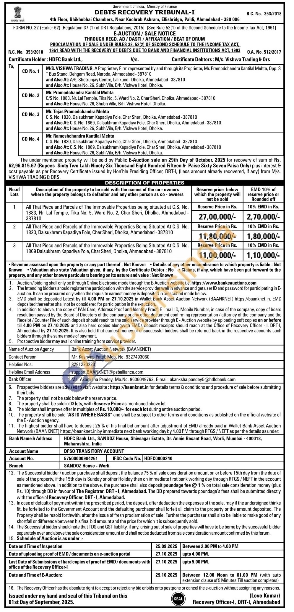 All That Piece and Parcels of The Immovable Properties being situated at C.S. No. 1883, Nr. Lal Temple, Tika No. 5, Ward No. 2, Char Sheri, Dholka, Ahmedabad -387810