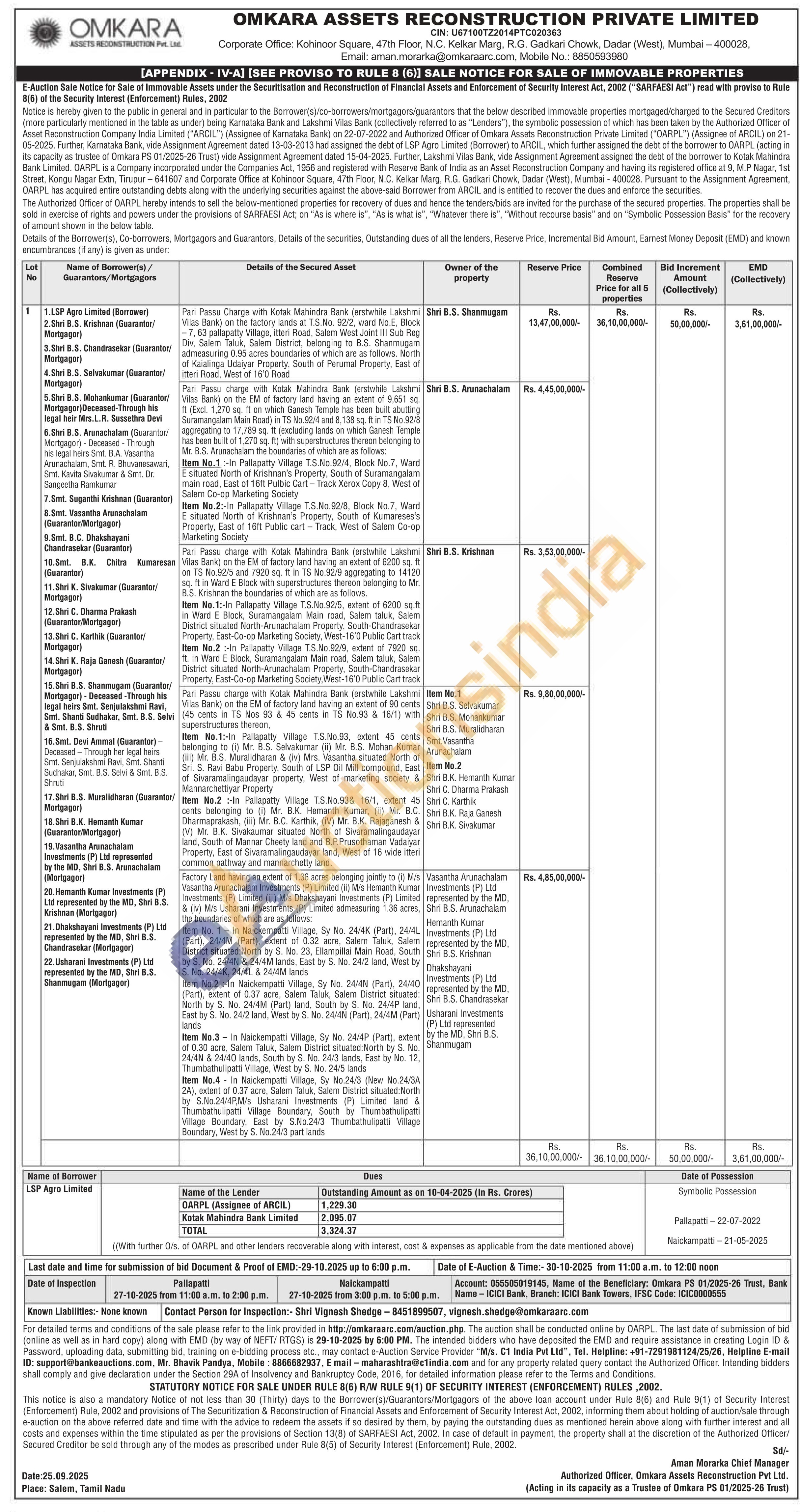 2) Pari Passu charge with Kotak Mahindra Bank (erstwhile Lakshmi Vilas Bank) on the EM of factory land having an extent of 9,651 sq. ft (Excl. 1,270 sq. ft on which Ganesh Temple has been built abutting Suramangalam Main Road) in TS No.92/4 and 8,138 sq. ft in TS No.92/8 aggregating to 17,789 sq. ft (excluding lands on which Ganesh Temple has been built of 1,270 sq. ft) with superstructures thereon belonging to Mr. B.S. Arunachalam the boundaries of which are as follows: Item No.1-In Pallapatty Village T.S.No.92/4, Block No.7, Ward E situated North of Krishnan's Property, South of Suramangalam main road, East of 16ft Pulbic Cart-Track Xerox Copy 8. West of Salem Co-op Marketing Society Item No.2:-In Pallapatty Village T.S.No.92/8, Block No.7, Ward E situated North of Krishnan's Property, South of Kumareses's Property, East of 16ft Public cart Track, West of Salem Co-op Marketing Society
