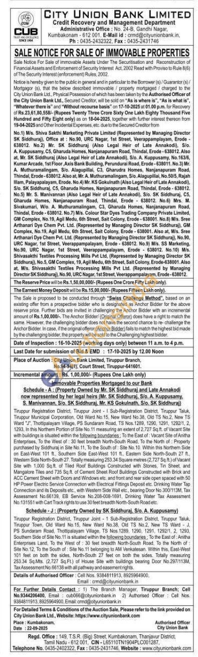 Contact Branch Manager, Tiruppur Branch: Cell No.9344206400 2) Authorised Officer Cell Nos. 9384811913, 8925964900