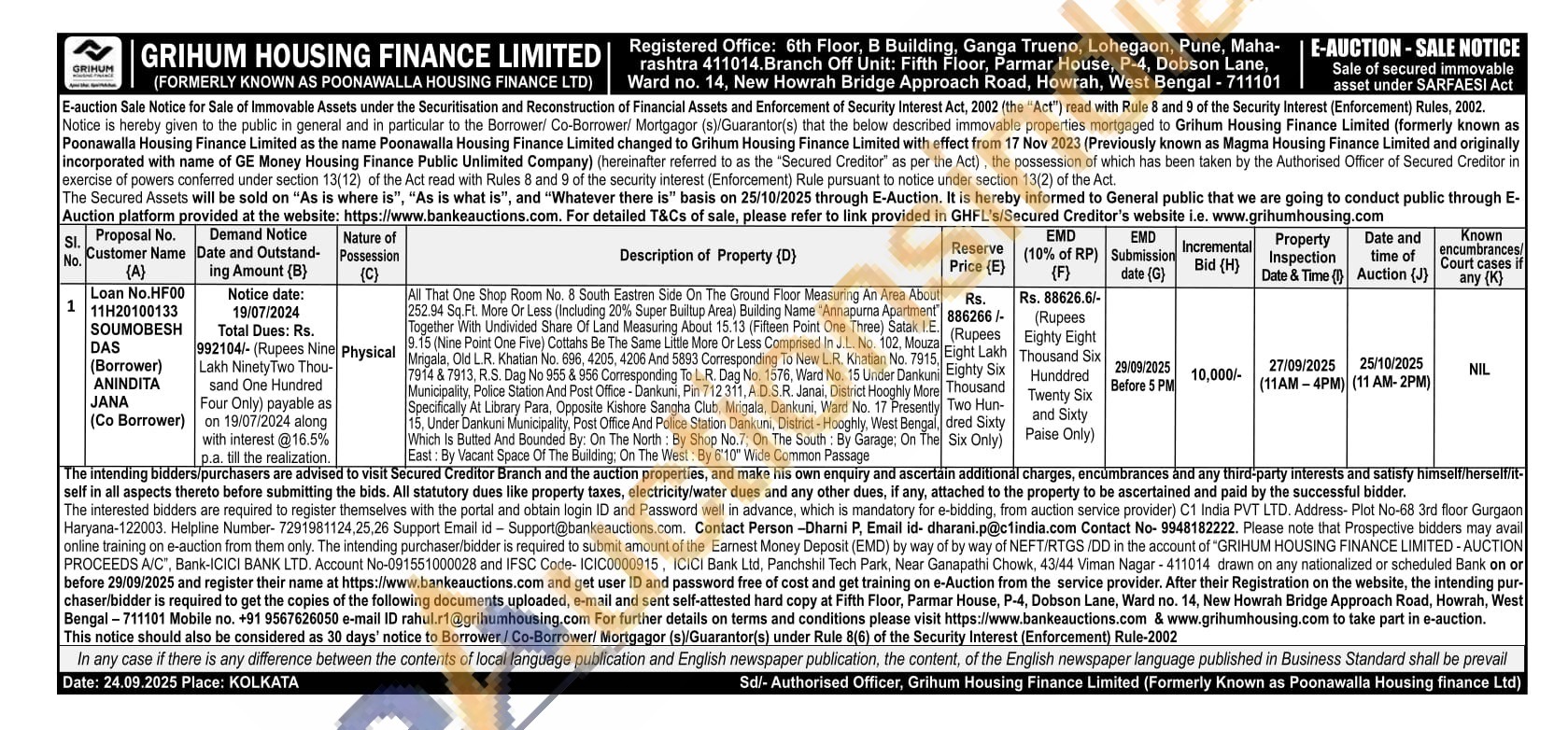 All That One Shop Room No. 8 South Eastren Side On The Ground Floor Measuring An Area About Rs. 252.94 Sq.Ft. More Or Less (Including 20% Super Builtup Area) Building Name "Annapuma Apartment Together With Undivided Share Of Land Measuring About 15.13 (Fifteen Point One Three) Satak I.E. (Ning Point One Five) Cottahs Be The Little More Or Less Comprised In J.L. No. 102, Mouza Migala, Old L.R. Khatian No. 696 4205, 4206 And 5893 Corresponding To New L.R. Khatian No. 7915. 7914 & 7913, R.S. Dag No 955 & 956 Corresponding To L.R. Dag No, 1576, Ward No. 15 Under Dankuni Municipality, Police Station And Post Office-Dankuni, Pin 712311, A.D.S.R. Janai, District Hooghly More Specifically At Library Para, Opposite Kishore Sangha Club, Mrigala. Dankuni, Ward No. 17 Presendy 15, Under Darkuni Municipality, Post Office And Police Station Dankuni, District-Hooghly, West Bengal Which Is Butted And Bounded By: On The North: By Shop No.7: On The South: By Garage: On The East: By Vacant Space Of The Building: On The West: By 6'10" Wide Common Passage