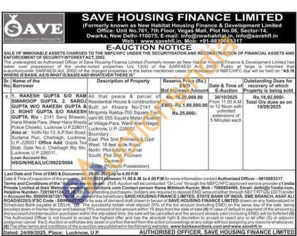 All that peace & parcel of Residential House & constructions Built on Khasra No-2141 Minjumla Rakba-700 Square Feet yani 65.055 Square Meter situated at Village-Para, Ward-Alami Nagar Lucknow, U.P-226001 Boundary East Plot Smt Premlata & Dipti West: 18 feet wide Road North: Plot Adarsh Kumar South, Plot Smt. Poonam Dwevedi (Under Physical Possession)