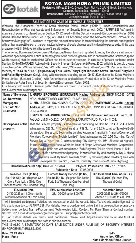 That the subject property is Commercial consisting of Unit No. 214 & 214 A both admeasuring 528 Sq. Ft (Carpet area) i.e. 739 Sq. ft. i.e. 68.65 sq. mtrs. (Saleable Built-Up area), on the second floor, in the building known as "Inspiria" in "Inspiria Commercial Premises Co-operative Society Limited" land admeasuring 2010.56 Sq. mtrs. Out of Survey No. 3, Hissa No. 2, corresponding City Survey No. 984, Situated at Nighadi, Taluka-Haveli District-Pune, within the limits of Pimpri Chinchwad Municipal Corporation, Taluka-Haveli, Pune and within the limits of Sub-Registrar, Taluka Haveli, Pune-411044. Boundary of the aforementioned property: Towards East: By land bearing S. No. 3, Hissa No. 03, Towards West By Road, Towards North: By remaining (Non Gaothan) area with Arihant Developers of S. No. 3/2., Towards South: By Road (Pune-Mumbai Highway)