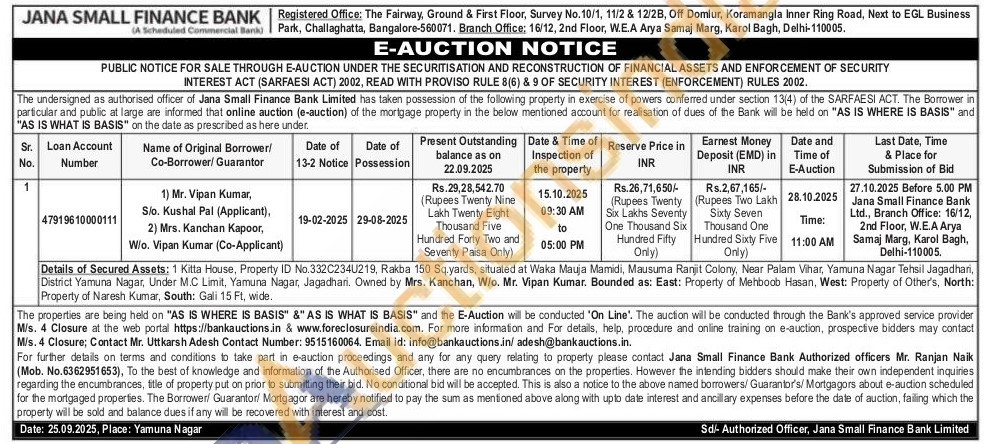1 Kitta House, Property ID No.332C234U219, Rakba 150 Sq.yards, situated at Waka Mauja Mamidi, Mausuma Ranjit Colony, Near Palam Vihar, Yamuna Nagar Tehsil Jagadhari, District Yamuna Nagar, Under M.C Limit, Yamuna Nagar, Jagadhari. Owned by Mrs. Kanchan, W/o. Mr. Vipan Kumar. Bounded as: East: Property of Mehboob Hasan, West: Property of Other's, North: Property of Naresh Kumar, South: Gali 15 Ft, wide.