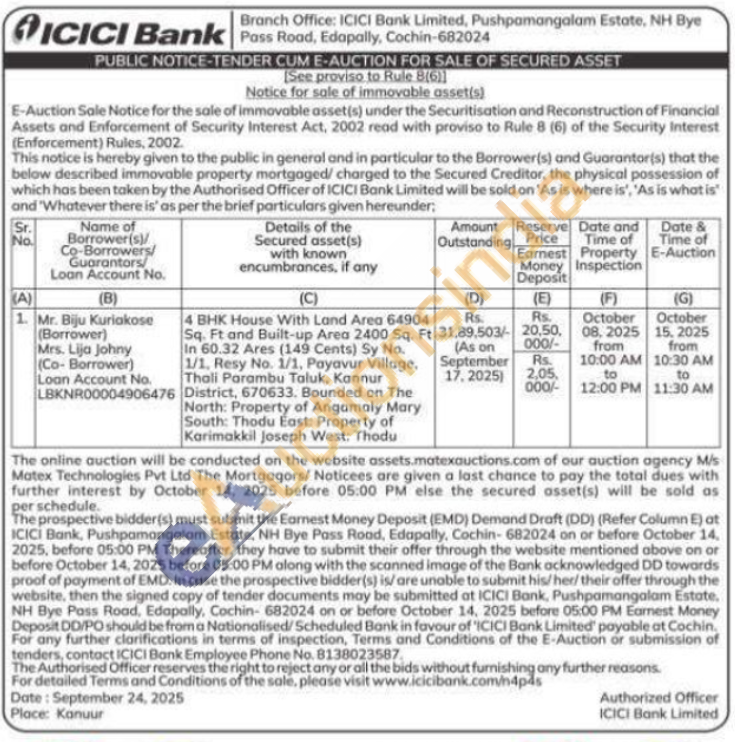 4 BHK House With Land Area 64904 Sq. Ft and Built-up Area 2400 Sq. Ft In 60.32 Ares (149 Cents) Sy No. 1/1, Resy No. 1/1, Payavur Village, Thali Parambu Taluk, Kannur District, 670633. Bounded on The North: Property of Angamaly Mary South: Thodu East: Property of Karimakkil Joseph West: Thodu