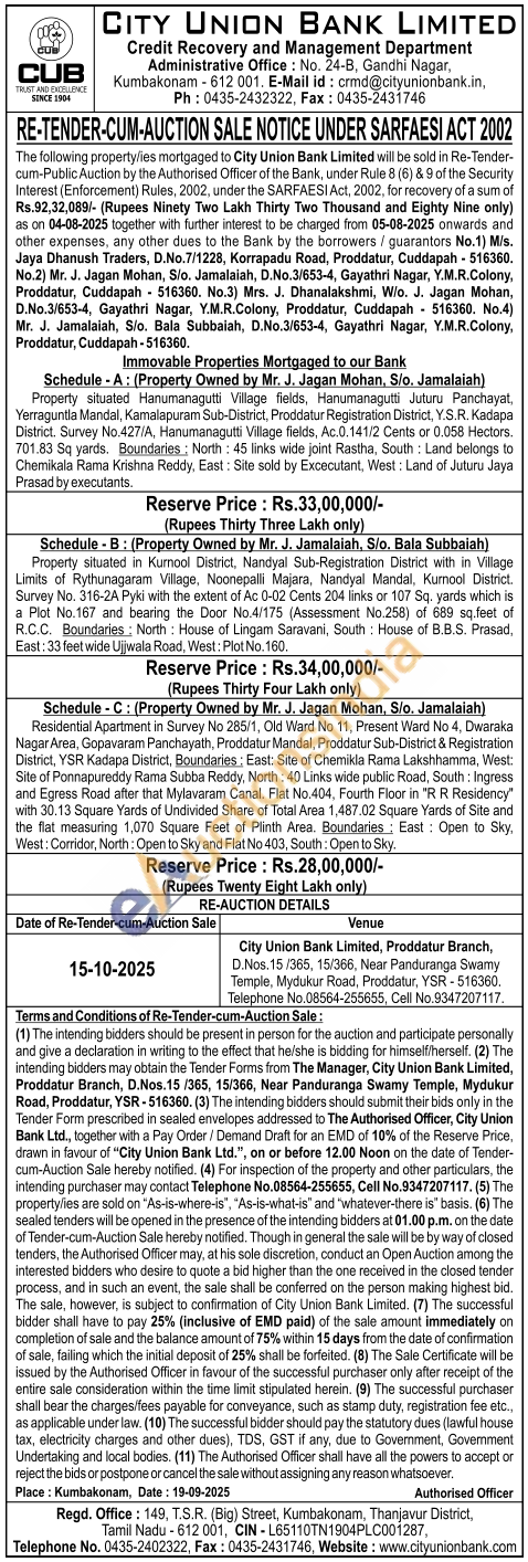 Residential Apartment in Survey No 285/1, Old Ward No 11, Present Ward No 4, Dwaraka Nagar Area, Gopavaram Panchayath, Proddatur Mandal, Proddatur Sub-District & Registration District, YSR Kadapa District, Boundaries: East: Site of Chemikla Rama Lakshhamma, West: Site of Ponnapureddy Rama Subba Reddy, North: 40 Links wide public Road. South: Ingress and Egress Road after that Mylavaram Canal. Flat No.404, Fourth Floor in "R R Residency" with 30.13 Square Yards of Undivided Share of Total Area 1,487.02 Square Yards of Site and the flat measuring 1,070 Square Feet of Plinth Area. Boundaries East: Open to Sky, West: Corridor, North: Open to Sky and Flat No 403, South: Open to Sky