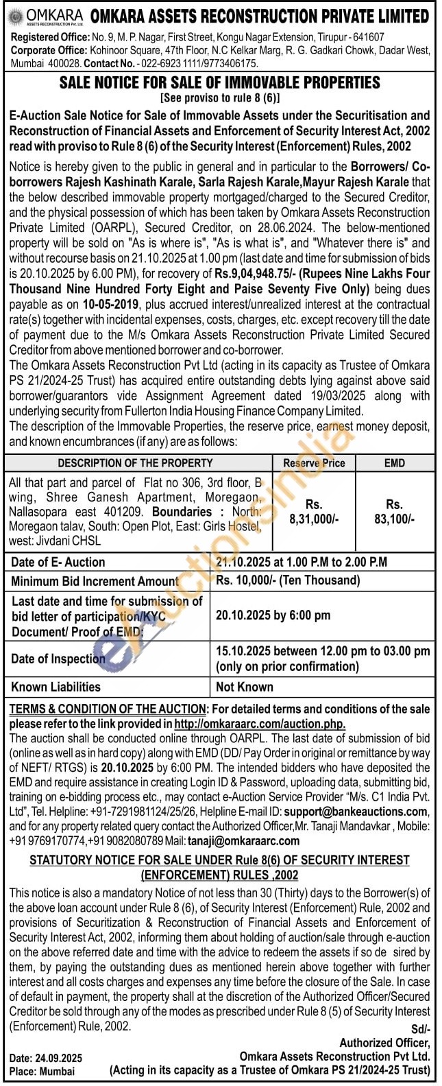 All that part and parcel of Flat no 306, 3rd floor, B wing, Shree Ganesh Apartment, Moregaon, Nallasopara east 401209. Boundaries: North: Moregaon talav, South: Open Plot, East: Girls Hostel, west: Jivdani CHSL