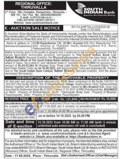 Al that part and parcel of land admeasuring 19.41 Ares comprised in Re. Sy.No 143/10/1 & 143/10/2 (Old Sy.No. 395/38, 3D) of Chenneerikara Village, Kozhencherry Taluk, Pathanamthitta District, together with all the improvements made therein, owned by Mrs. Aryamol S.D., more fully described in Settlement Deed No 217/2017 dated 17.01.2017 of SRO Pathanamthitta, BOUNDED on North Property of Radhakrishnan, South Panchayath Road East Property of Bhadran, Payantayyathu, West Property of Jagathansma, Payantayyathu