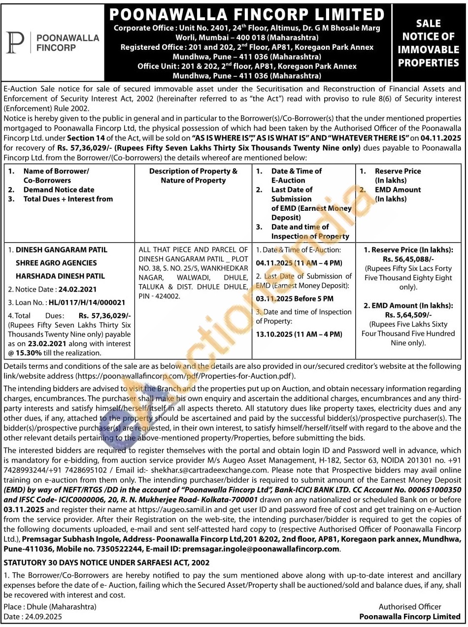 ALL THAT PIECE AND PARCEL OF DINESH GANGARAM PATIL_PLOT NO. 38, S. NO. 25/5, WANKHEDKAR NAGAR, WALWADI, DHULE, TALUKA & DIST. DHULE DHULE, PIN-424002