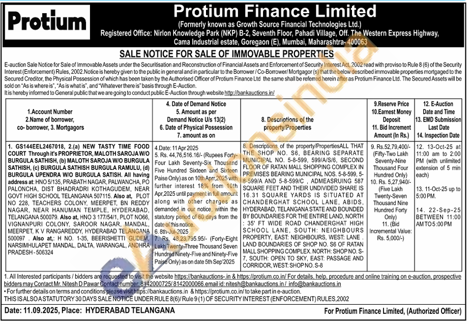 8. Descriptions of the property/PropertiesALL THAT THE SHOP NO. S6, BEARING SEPARATE MUNICIPAL NO. 5-8-599, 599/A/S/6, SECOND FLOOR OF RATAN MALL SHOPPING COMPLEX IN PREMISES BEARING MUNICIPAL NOS. 5-8-599, 5-8-599/A AND 5-8-599/C, ADMEASRUING 587 SQUARE FEET AND THEIR UNDIVIDED SHARE IS 16.31 SQUARE YARDS IS SITUATED AT CHANDERGHAT SCHOOL LANE, ABIDS, HYDERABAD, TELANGANA STATE AND BOUNDED BY BOUNDARIES FOR THE ENTIRE LAND, NORTH : 35' FT WIDE ROAD CHANDERGHAT HIGH SCHOOL LANE, SOUTH: NEIGHBOURS PROPERTY, EAST: NEIGHBOURS, WEST: LANE LAND BOUNDARIES OF SHOP NO. S6 OF RATAN MALL SHOPPING COMPLEX. NORTH: SHOP NO. S-7, SOUTH: OPEN TO SKY, EAST: PASSAGE AND CORRIDOR, WEST: SHOP NO.S-8